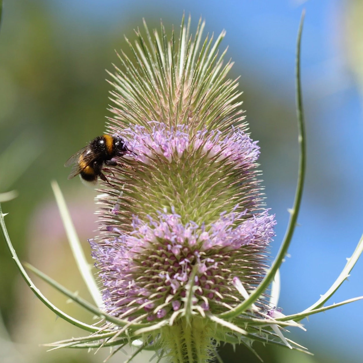 Die Wilde Karde ist eine zweijährige Wildpflanze, die sonnige Standorte zwar bevorzugt, aber auch mit Halbschatten gut zurecht kommt. Die Bildung der zarten violetten Blüten beginnt in der Mitte und setzt sich dann nach oben und unten fort.
